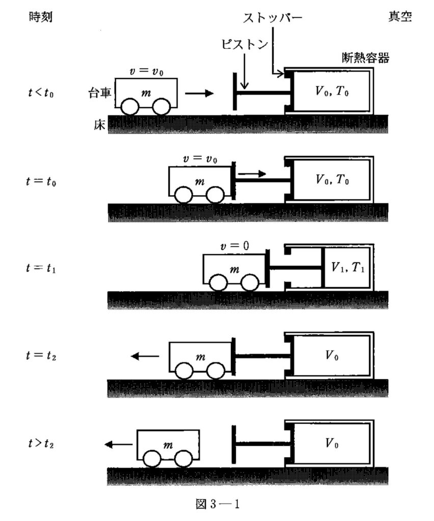 エネルギー保存則より、ピストンが元の状態に戻った$t_2$以降の台車の運動エネルギーは、ピストンを押す前($t_0$以前)の台車の運動エネルギーと等しくなる。