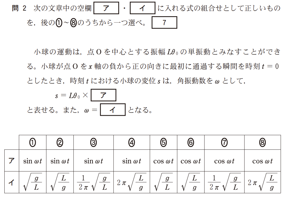 よって、[イ] には $\sqrt{\frac{g}{L}}$ が入ります。